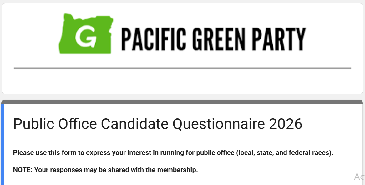 A number of candidates have expressed interest in seeking the Pacific Green Party nomination in 2026. The current list of prospective candidates are listed below in the order that we received their candidate questionnaire.